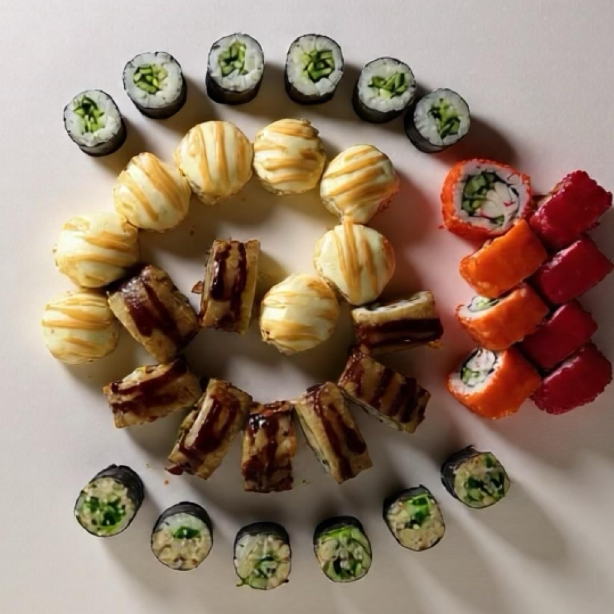 Кари ролл 8шт,Калифорния краб 8шт, Эби темпура 8шт, Огурец классика 6шт, Чука классика 6шт