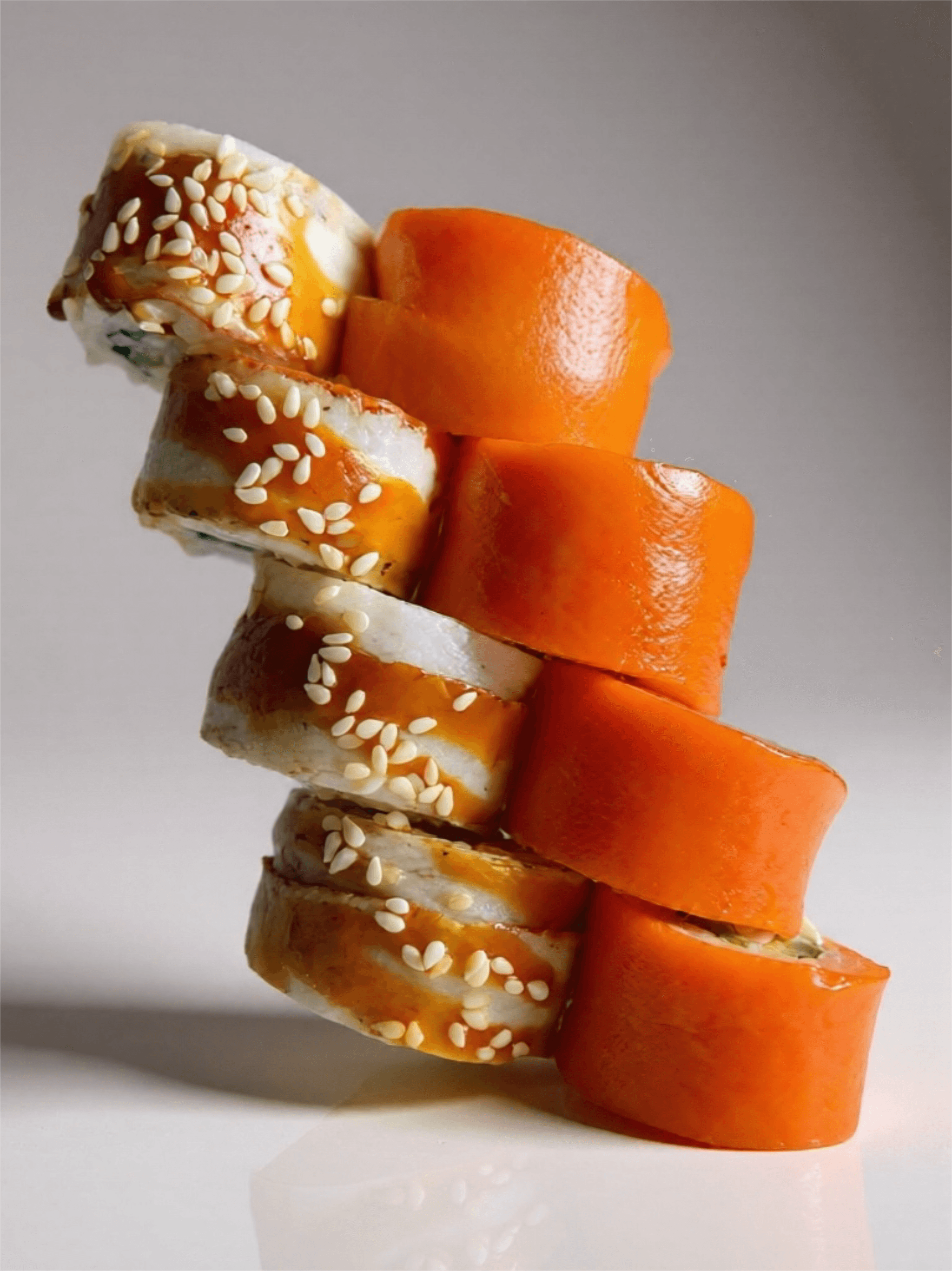 Сыр сливочный,огурец,лосось,угорь.соус терияке,кунжут
