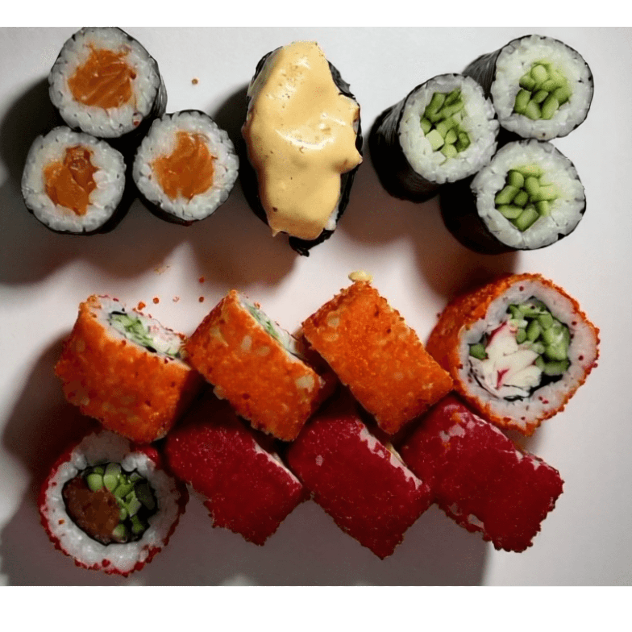 Калифорния лосось (4шт); Калифорния краб (4 шт); Огурец классик (4шт); Лосось классик (4шт)