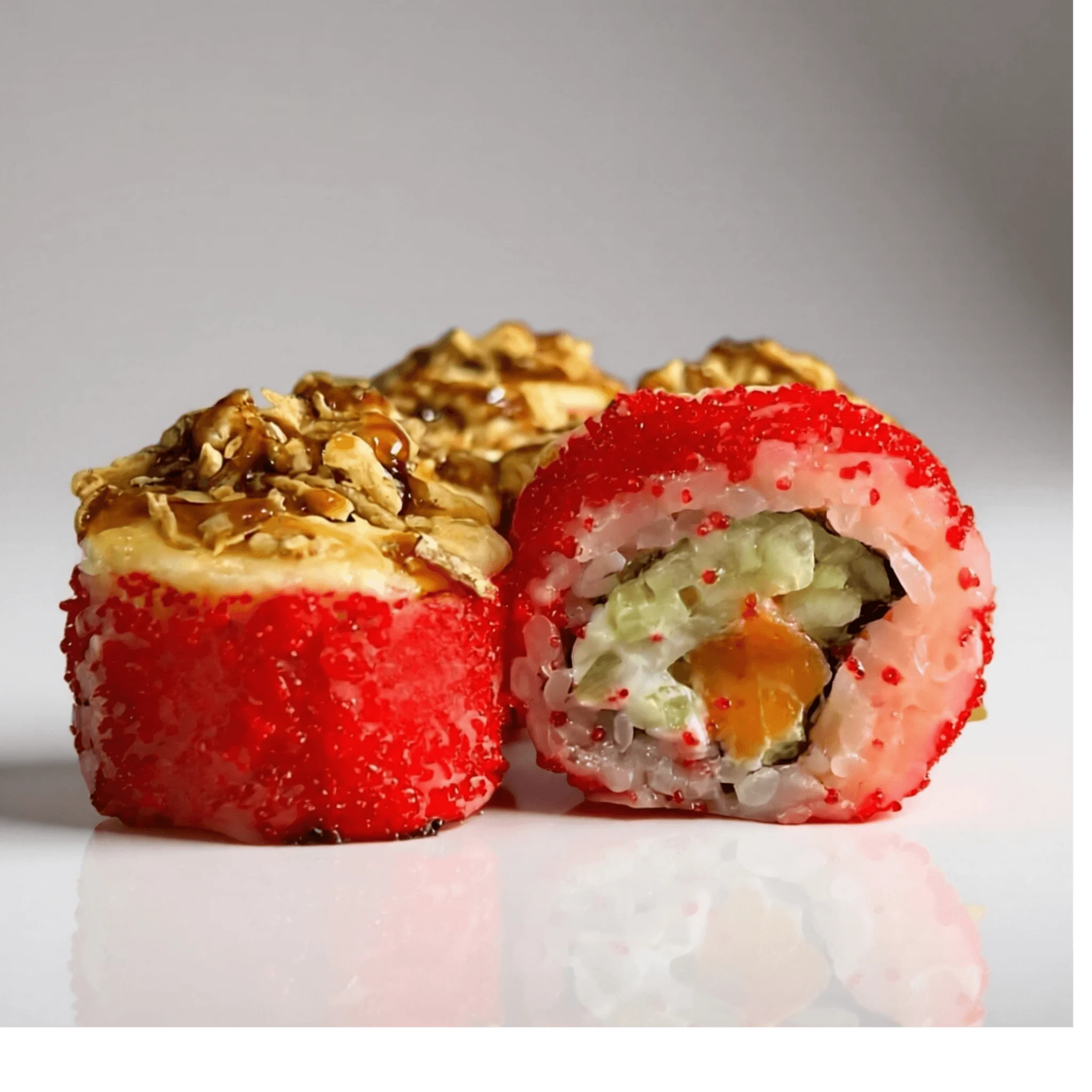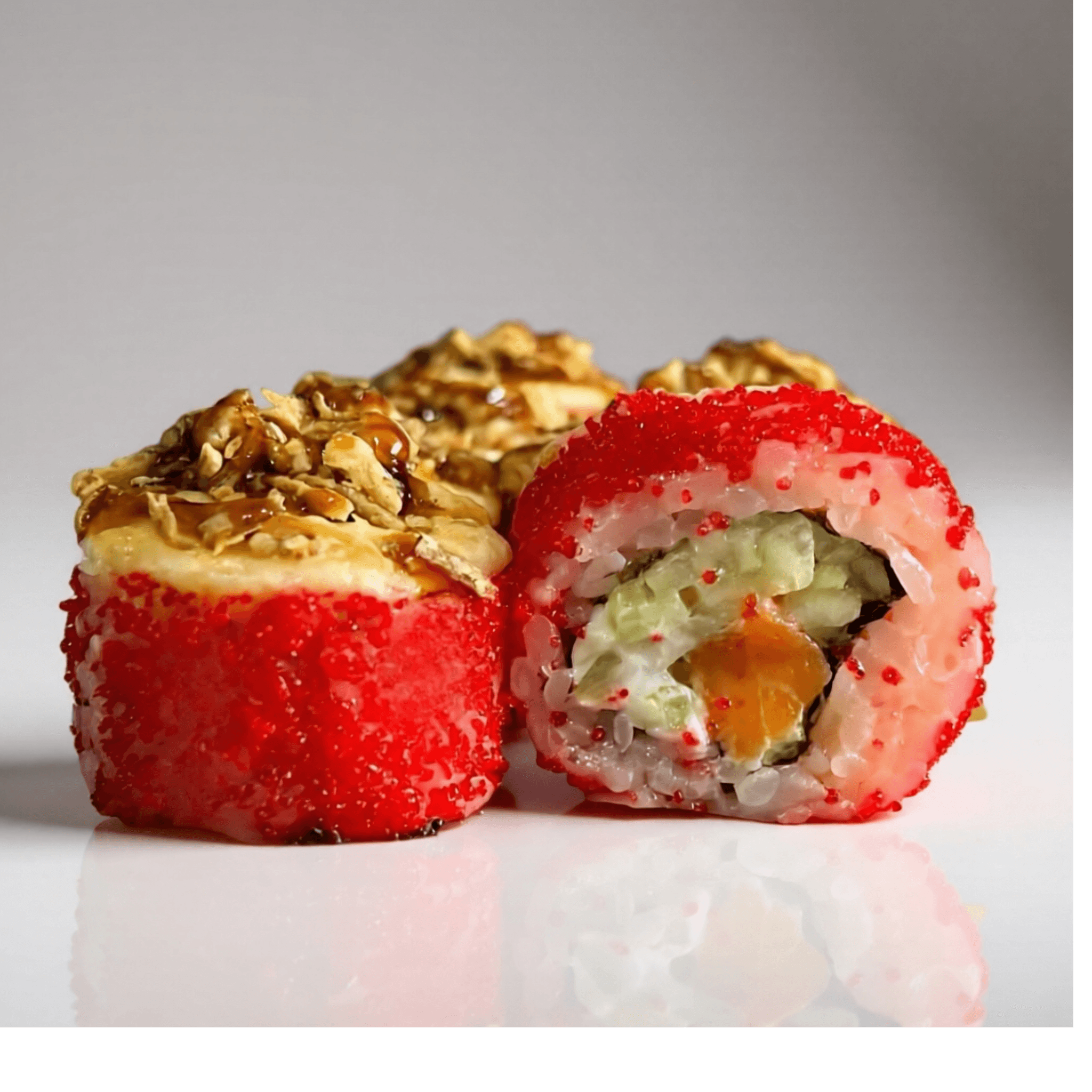 Рис, нори, лосось, майонез, огурец, масаго, сырная шапочка,соус терияки, лук криспи