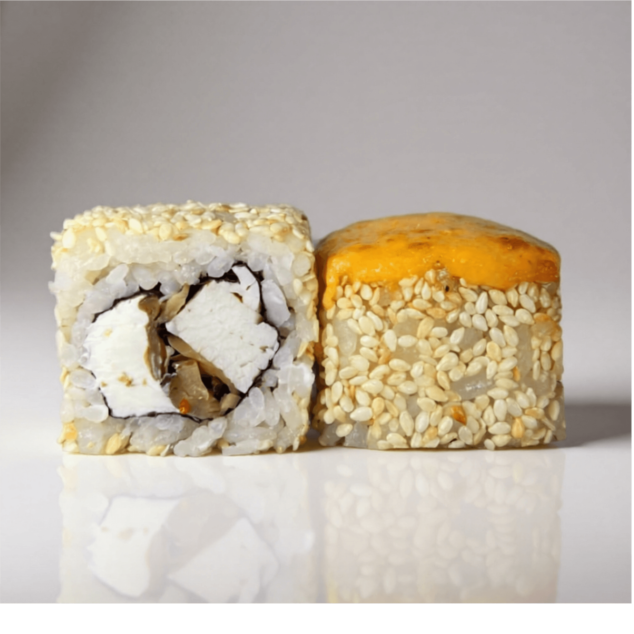 Рис, сливочный сыр, краб, грибы шитаки, кунжут белый, сыр Гауда, соус спайс(шапочка)