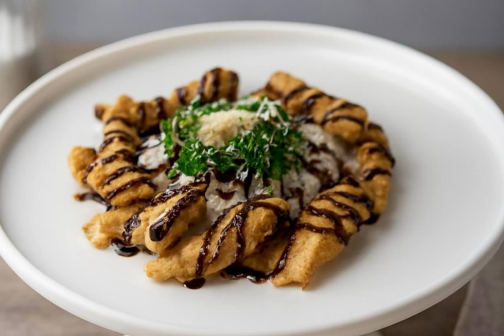 Рис,соус терияки,куриные крошки,чука,ореховый соус,кунжут