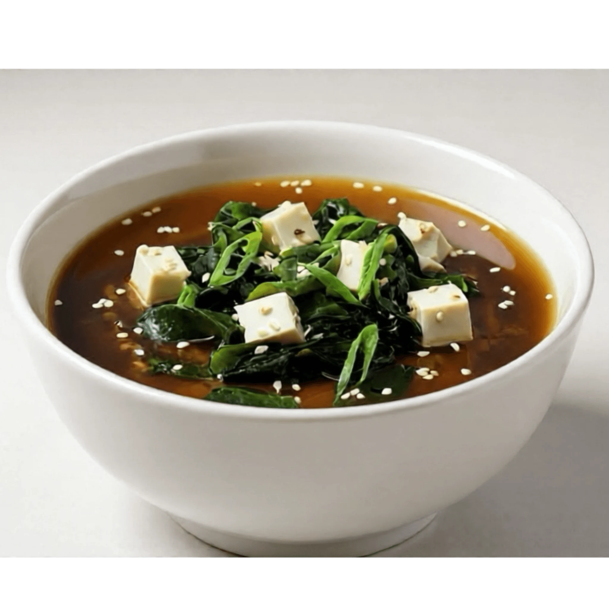 Водоросли вакаме, рыбный бульон , мисо паста, соевый соус,грибы шиитаке, сыр тофу, кунжут, зеленей лук