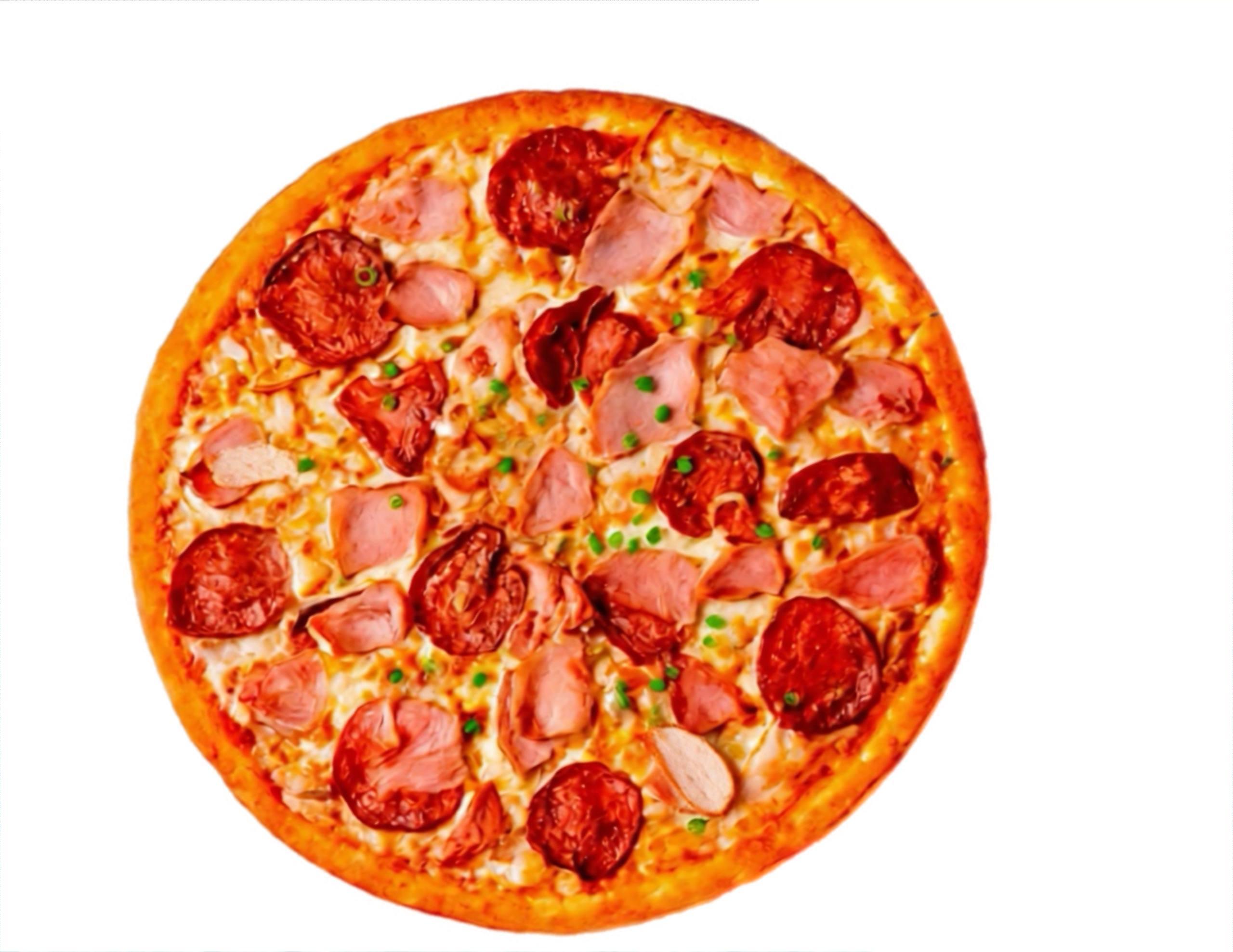 тесто,соус для пиццы(томатный),сыр моцарелла,куриное филе,колбаски пеперони,ветчина,томаты,прованские травы,зеленый лук