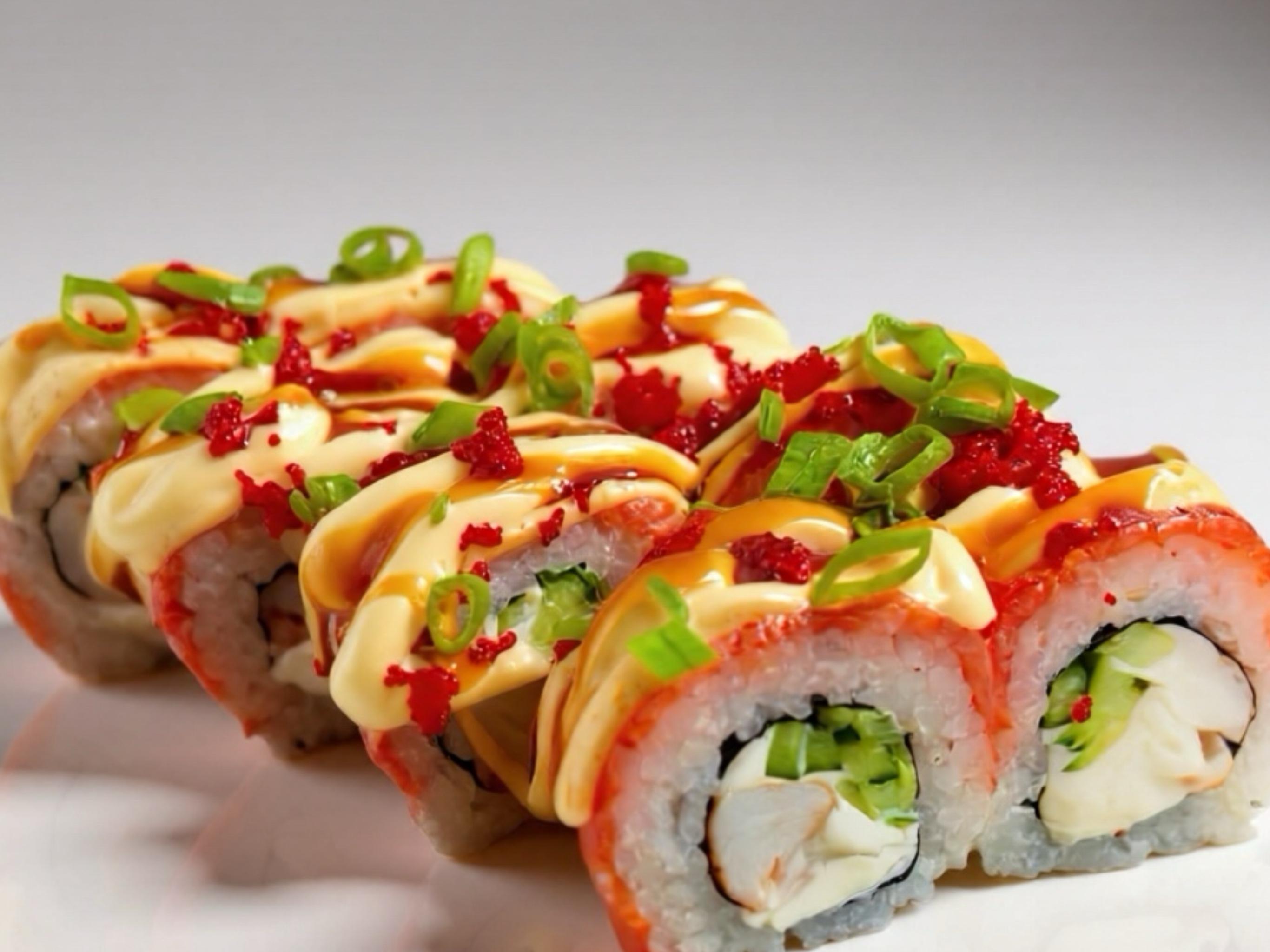 рис,нори, огурц, креветка тигровая, сыр сливочный ,лосось, соус сливочно-чесночный,соус спайс, соус тереяки, лук зеленый, масаго