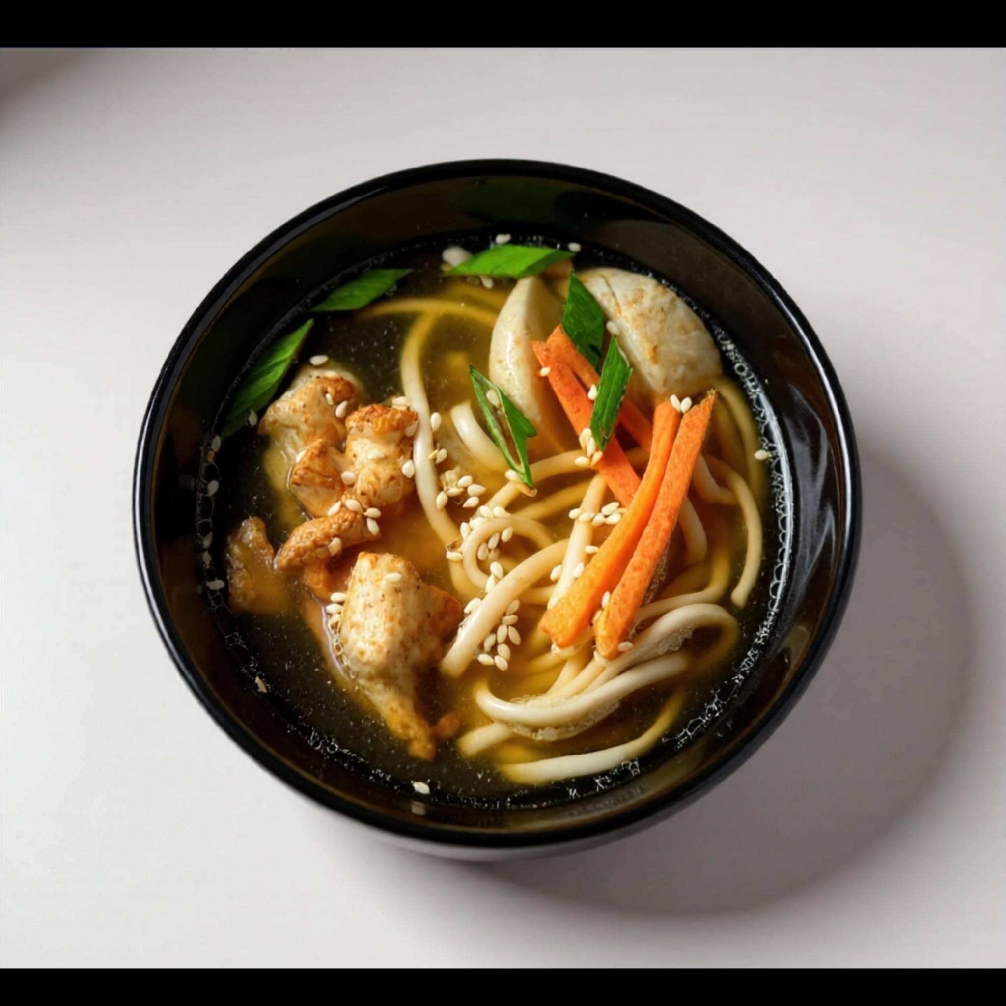 Бульон, морковь, лук репчатый, грибы шиитаке, куриное филе, лапша удон, кунжут, лук зелёный