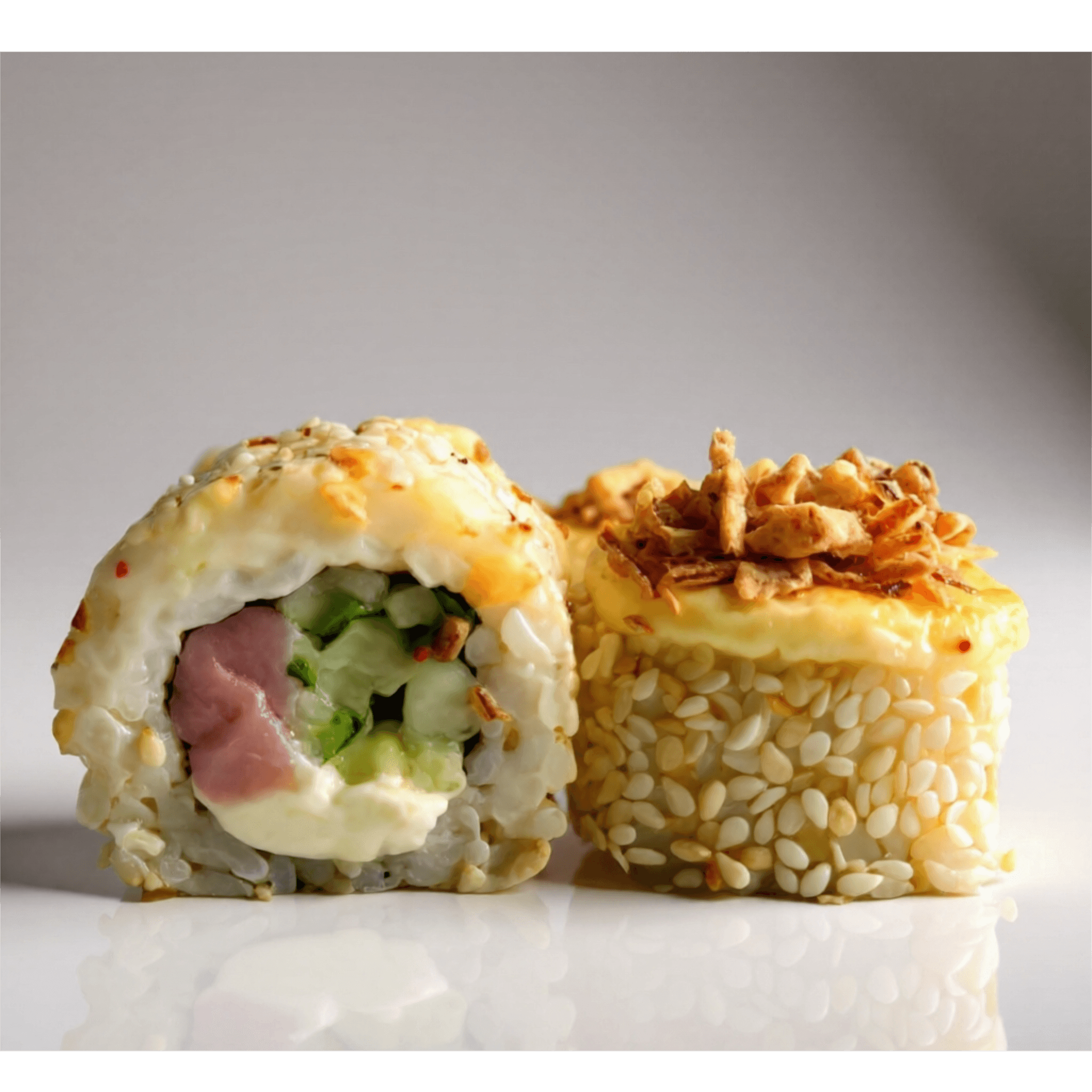 рис,сыр сливочный,нори,огурец,тунец,кунжут,лук криспи,спайс соус,сырная шапочка