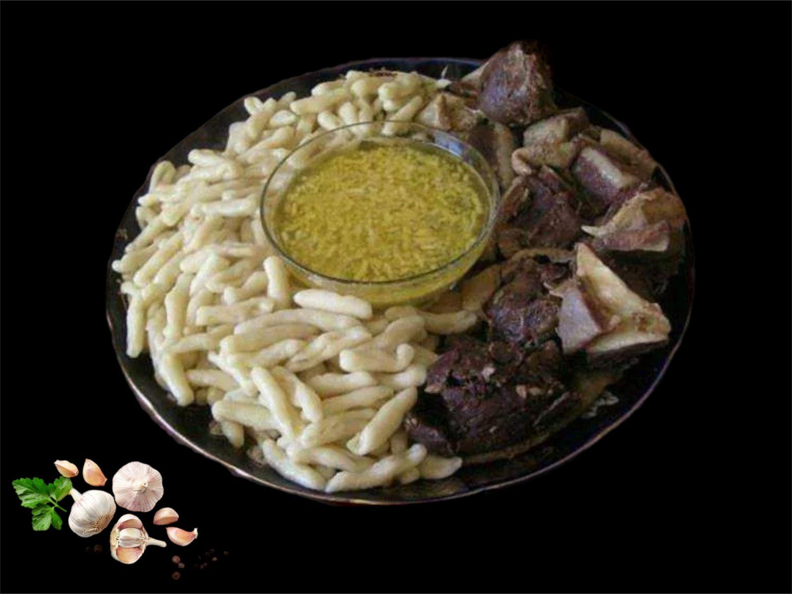 сушеное мясо из Дагестана,галушки из теста,чесночный соус,куриный бульон,соуса (аджика\сметана) идут отдельно см.меню соуса